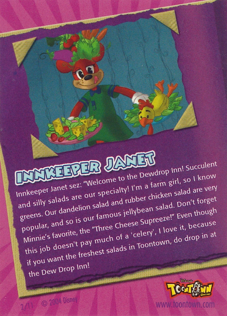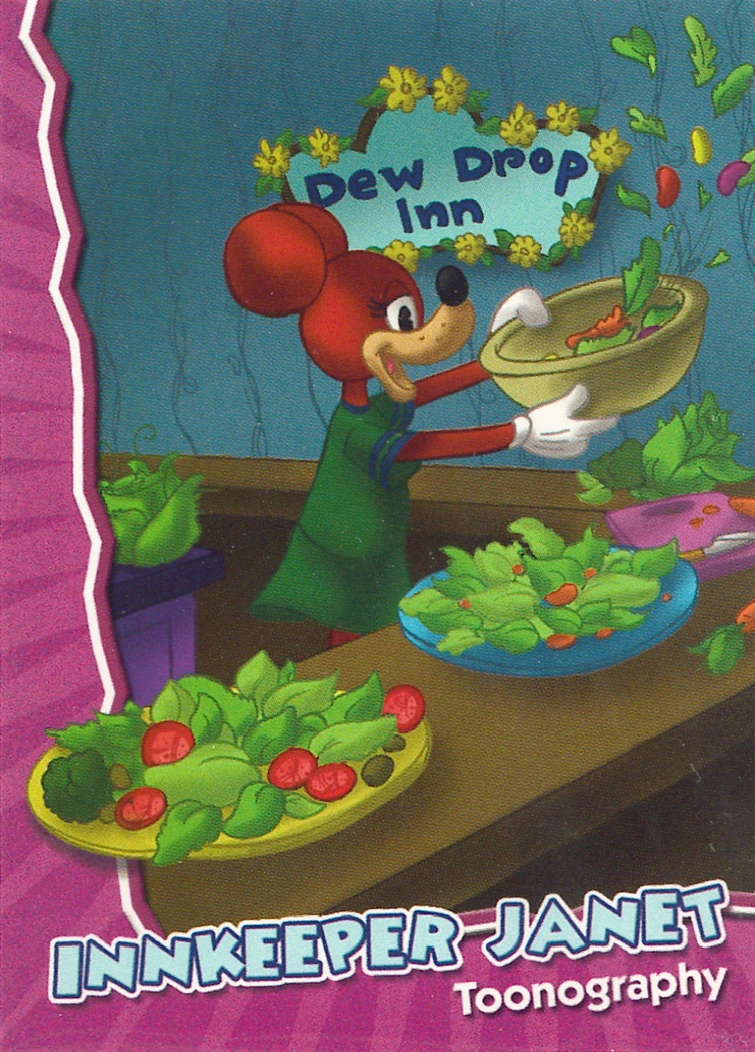 Innkeeper Janet is an NPC mouse Toon who owns Dew Drop Inn on Elm Street, Daisy Gardens.